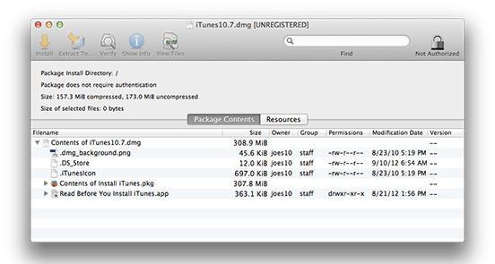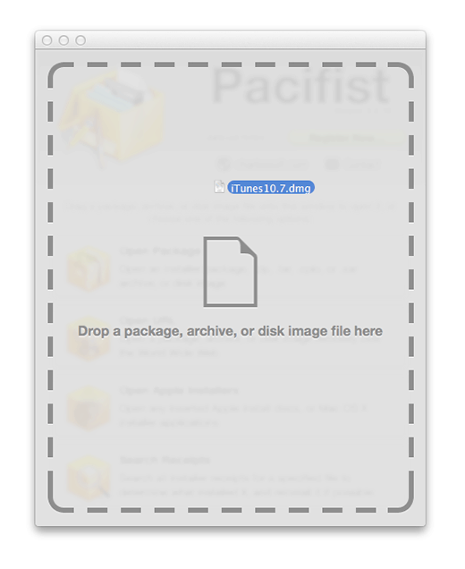 6) Drag and drop the iTunes 10.7.dmg file onto the main Pacifist window.