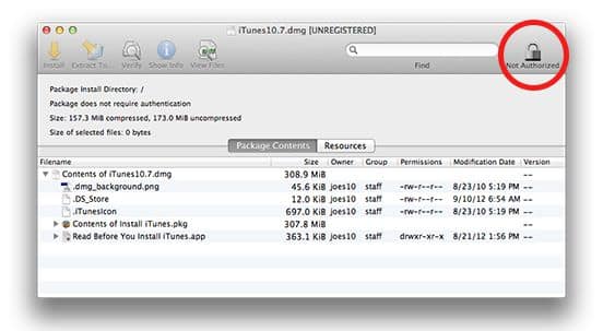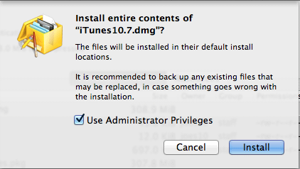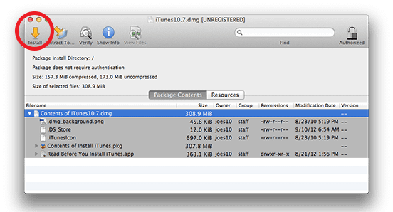 9) Select the first line in the list, “Contents of iTunes 10.7.dmg” and click the Install arrow icon.