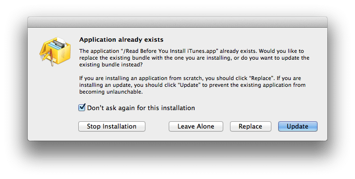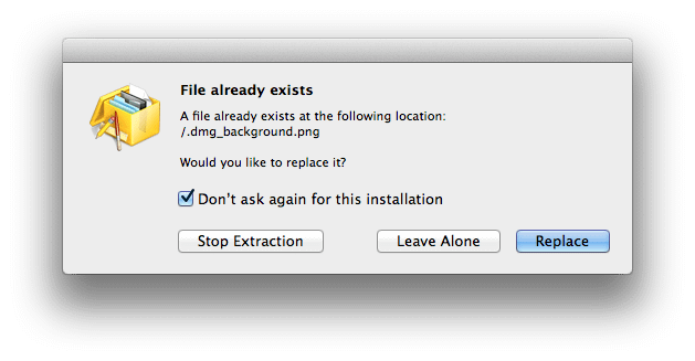For each dialog, check “Don’t ask again …” and always click the “Replace” button. Do this for every dialog that pops up through the remainder of the install.