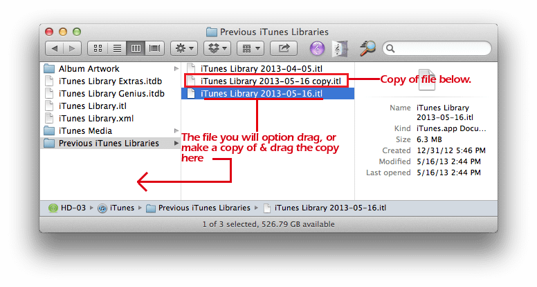 20) Change the name of the “iTunes Library 2013-xx-xx.itl” to “iTunes Library” or “iTunes Library.itl”, again depending on your the original file.